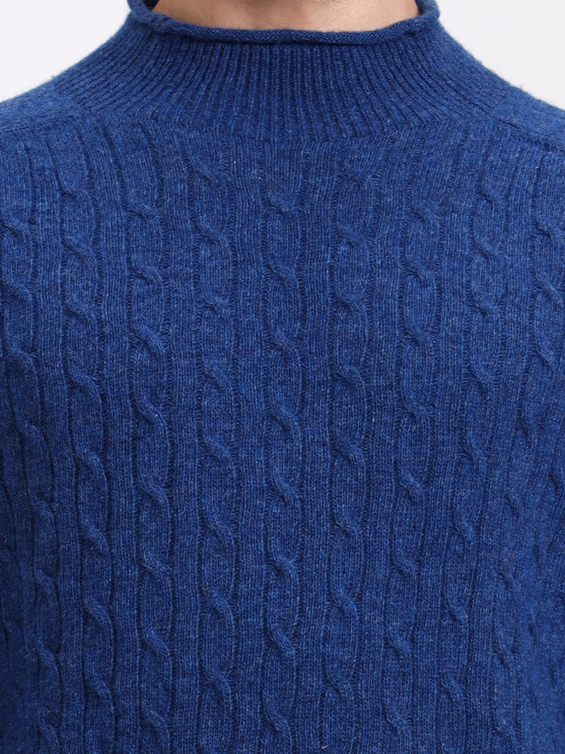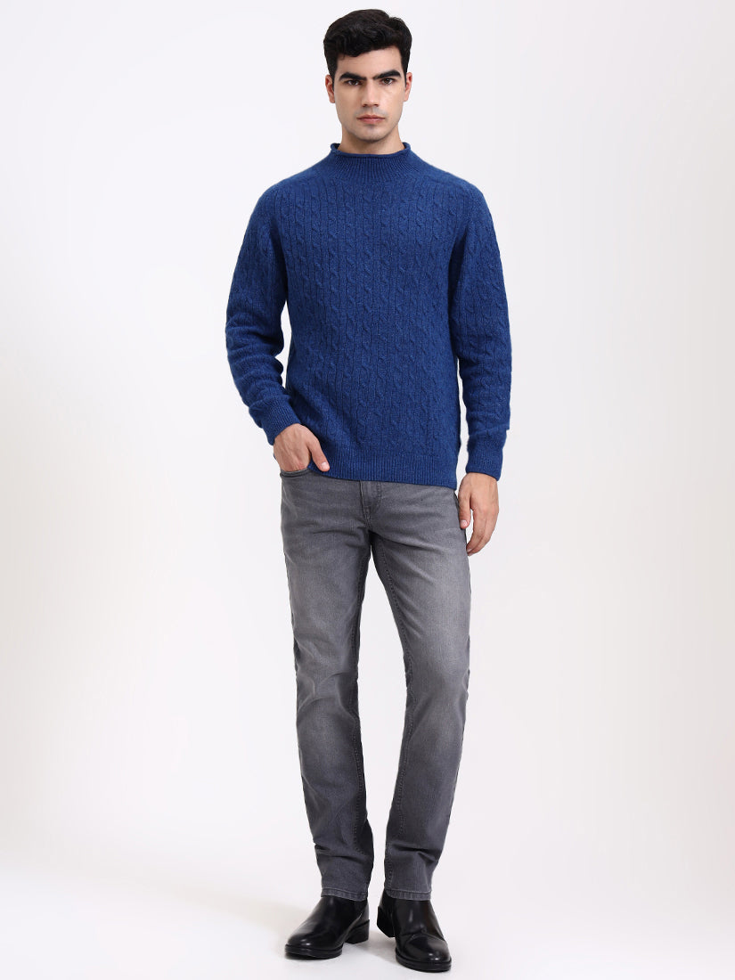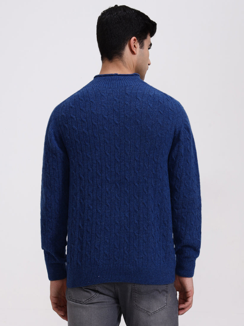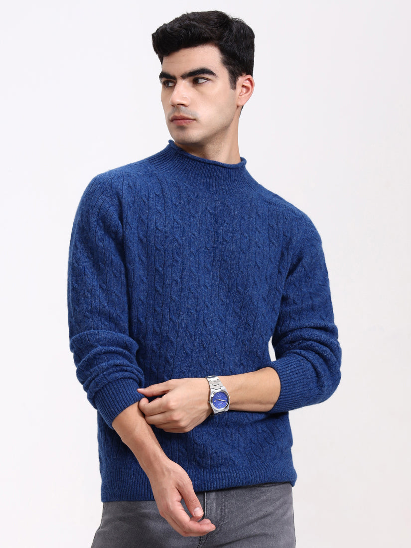 An understated blue-grey, evocative of coastal skies at dusk. The elevated neckline and structured cables lend a quiet masculinity, ideal for smart winter layering.