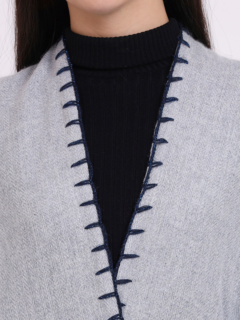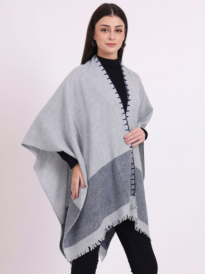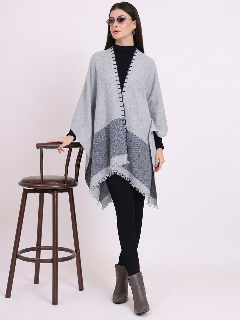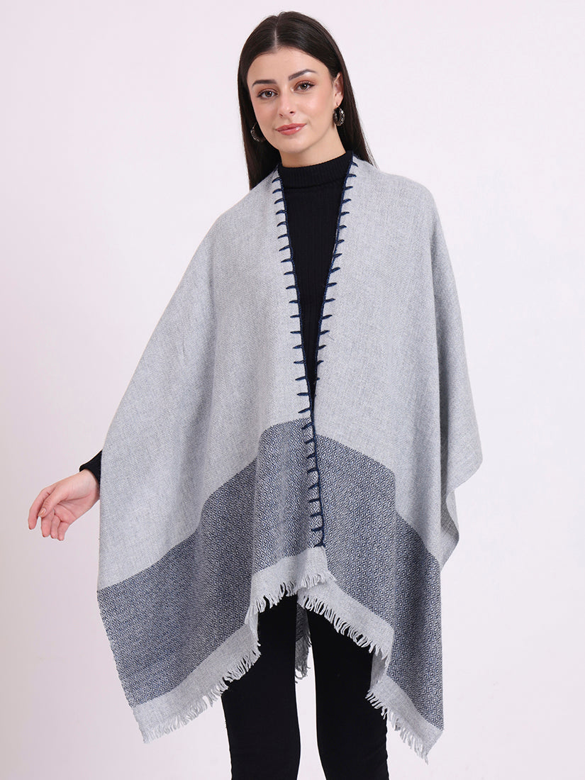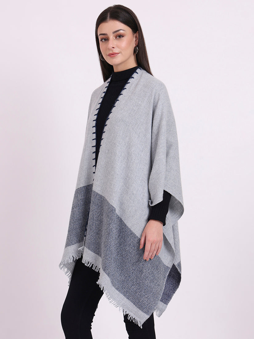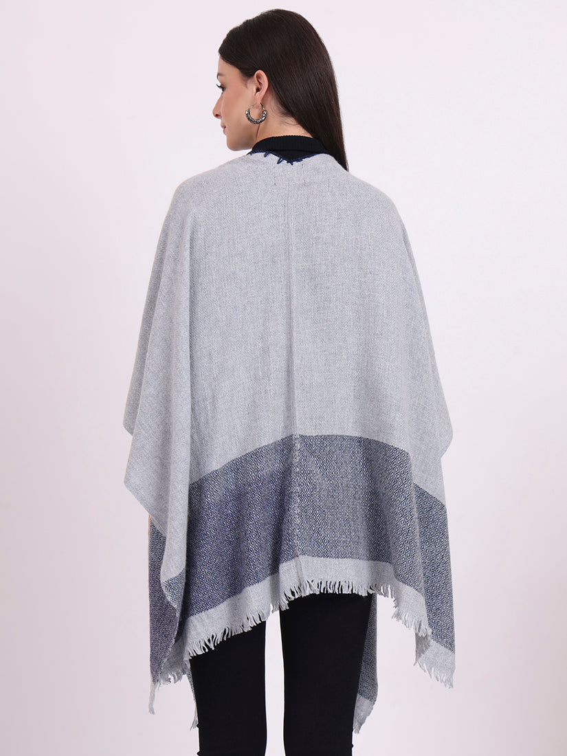 Woven in lambswool, the Twilight Crest Cape combines deep navy tones with soft grey to create a striking yet harmonious balance. The fringed finish and structured flow echo artisanal tradition while remaining effortlessly modern.