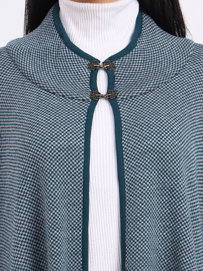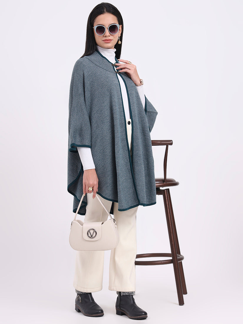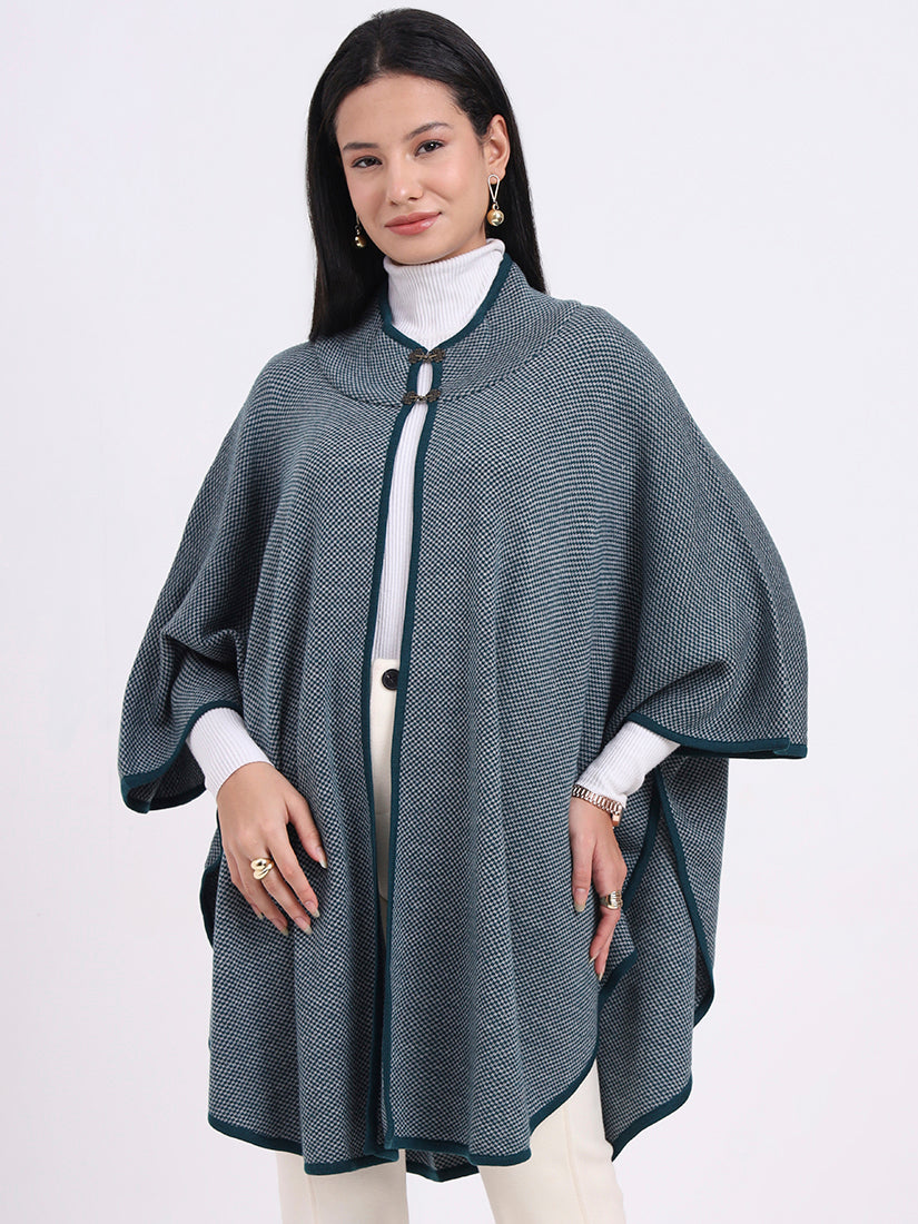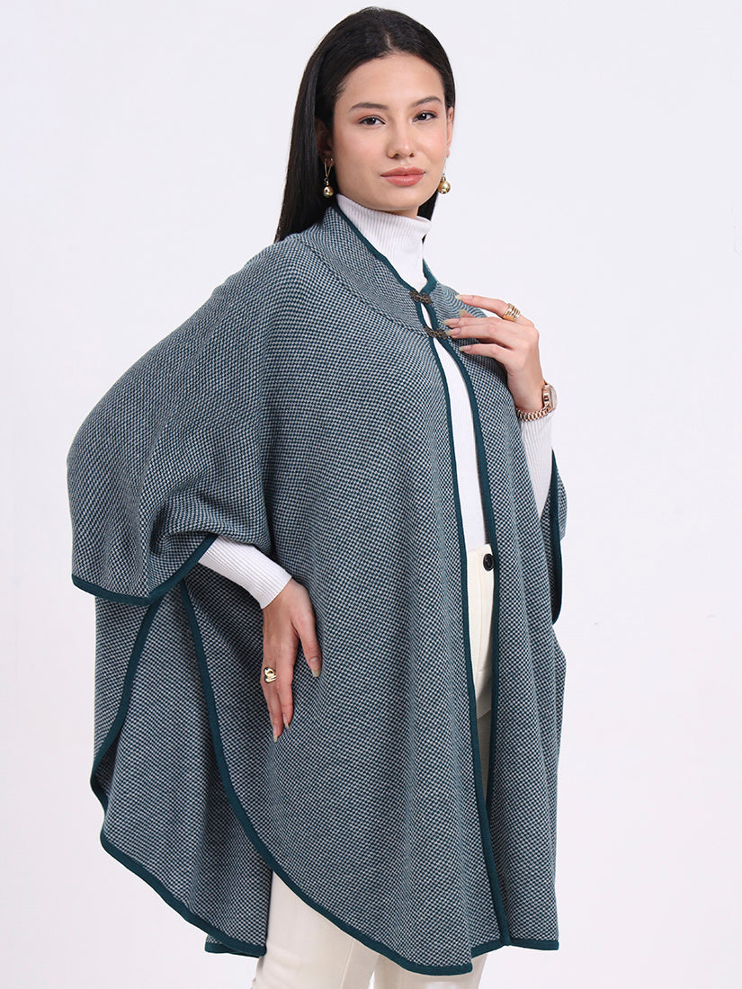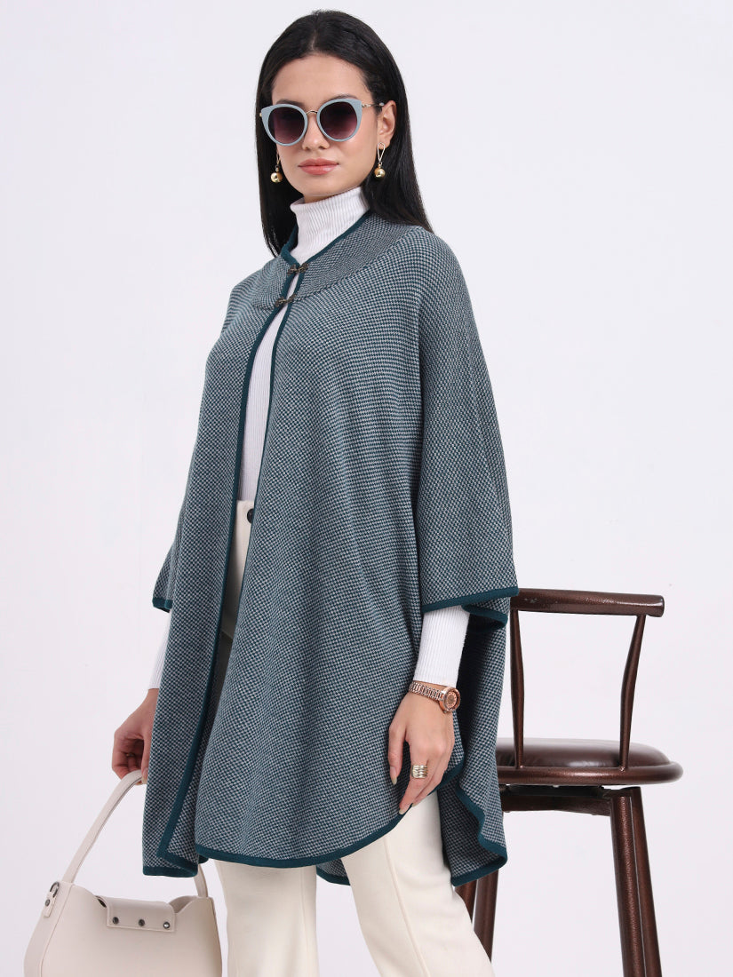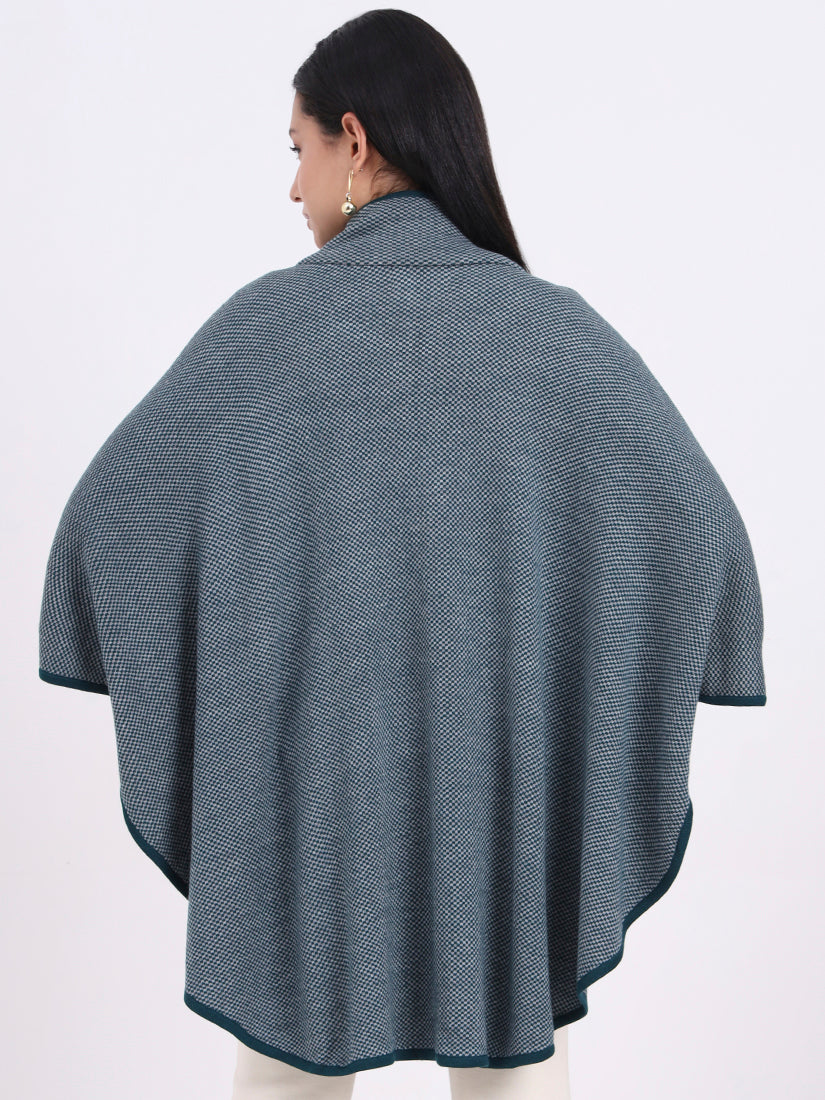 Crafted in wool with a rich green hue, the Verdant Weave Cape channels natural elegance. Its flowing drape and subtle detailing make it a statement of refined simplicity.