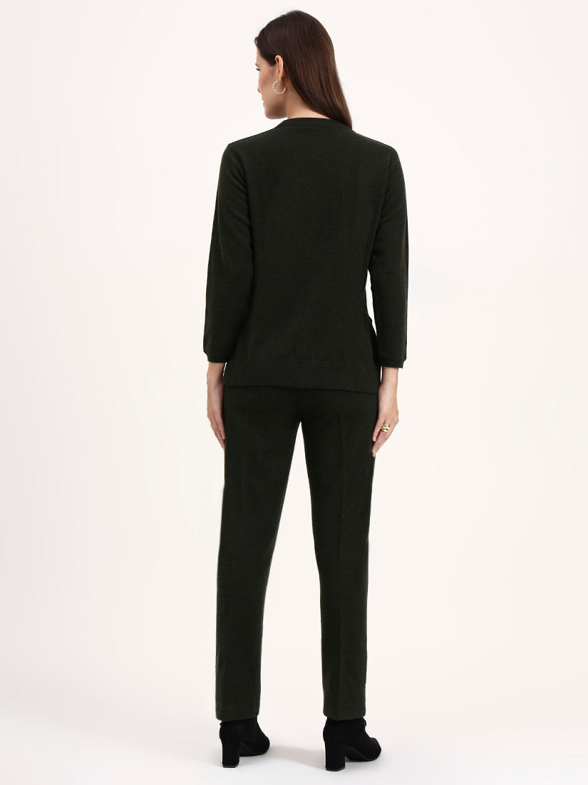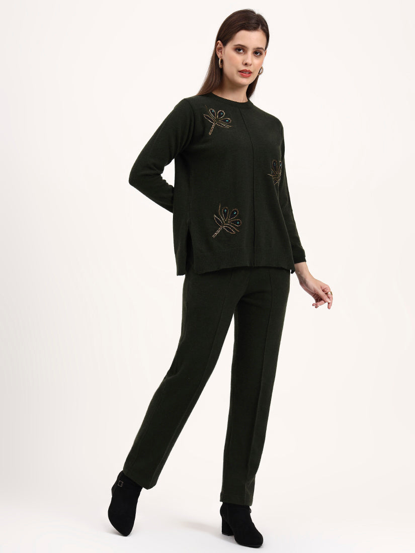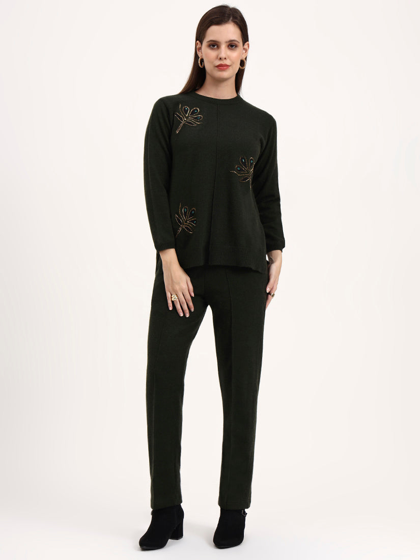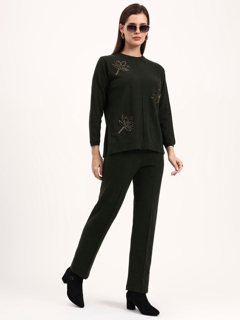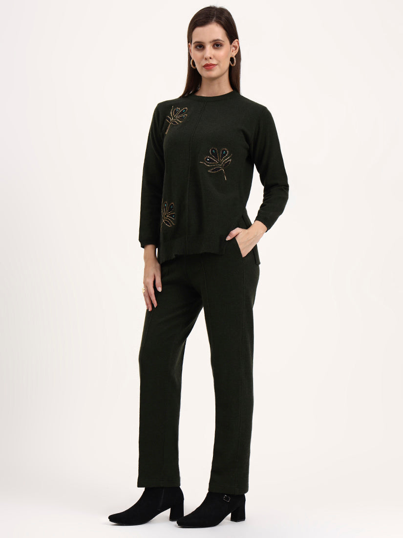 In a soothing olive hue inspired by winter forests, this set brings understated charm and graceful presence. The floral motifs add a handcrafted touch while maintaining a clean, minimal silhouette. A refined essential for those who prefer nature-inspired tones and effortless coordination.