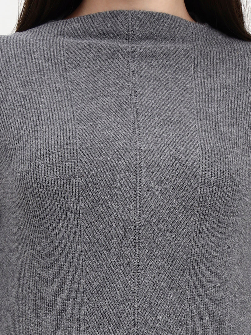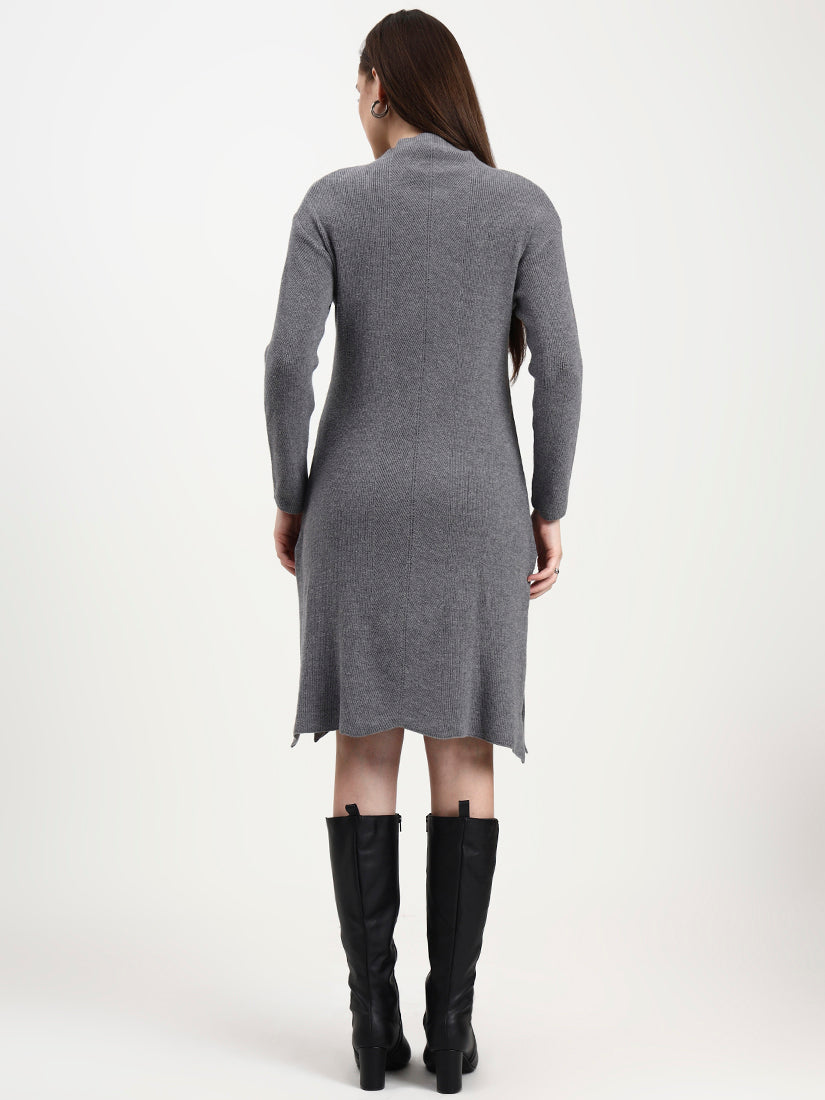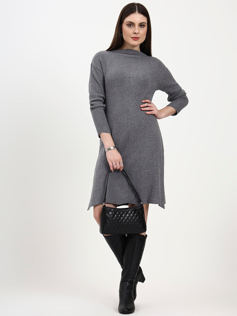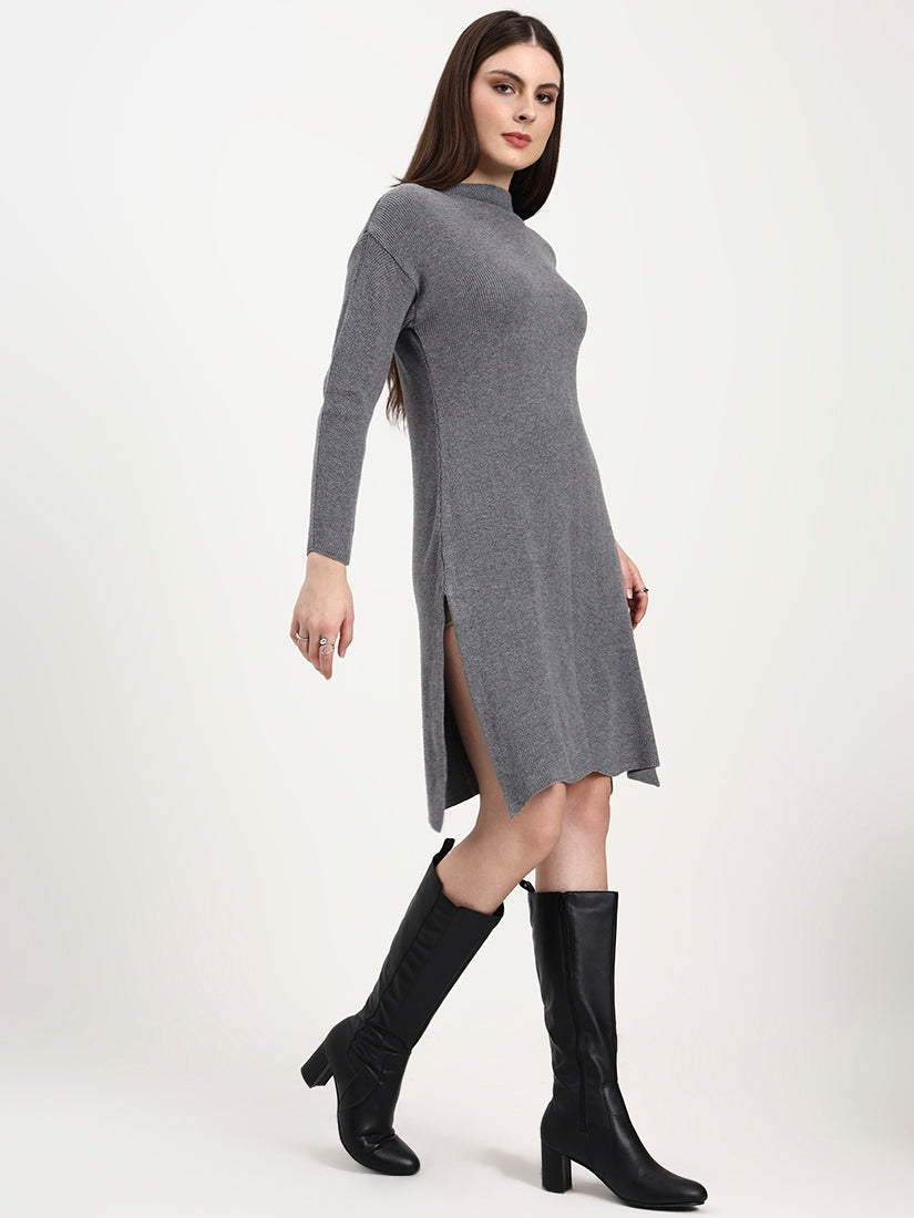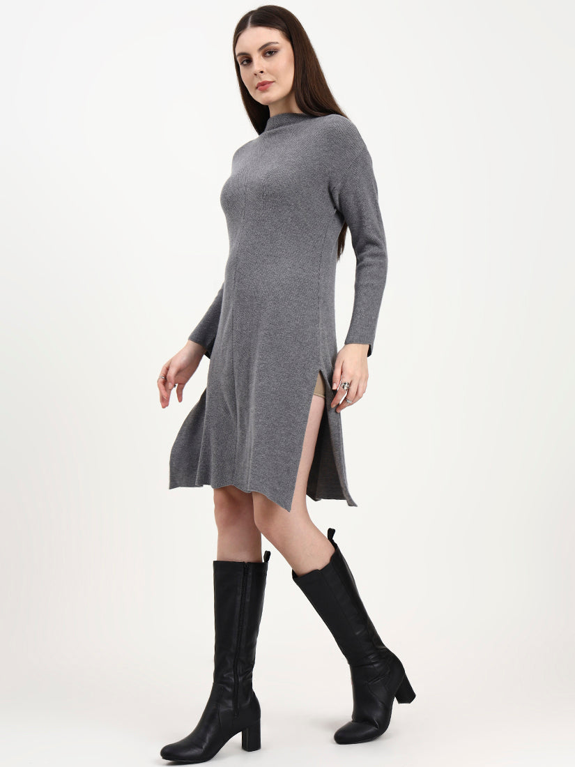An understated statement in pure wool, this fine-ribbed dress features a high neckline, long sleeves, and soft side slits that move gracefully with every step. Its sculpted silhouette and heather-grey tone create a look of effortless sophistication, perfect for refined winter days or evenings out.