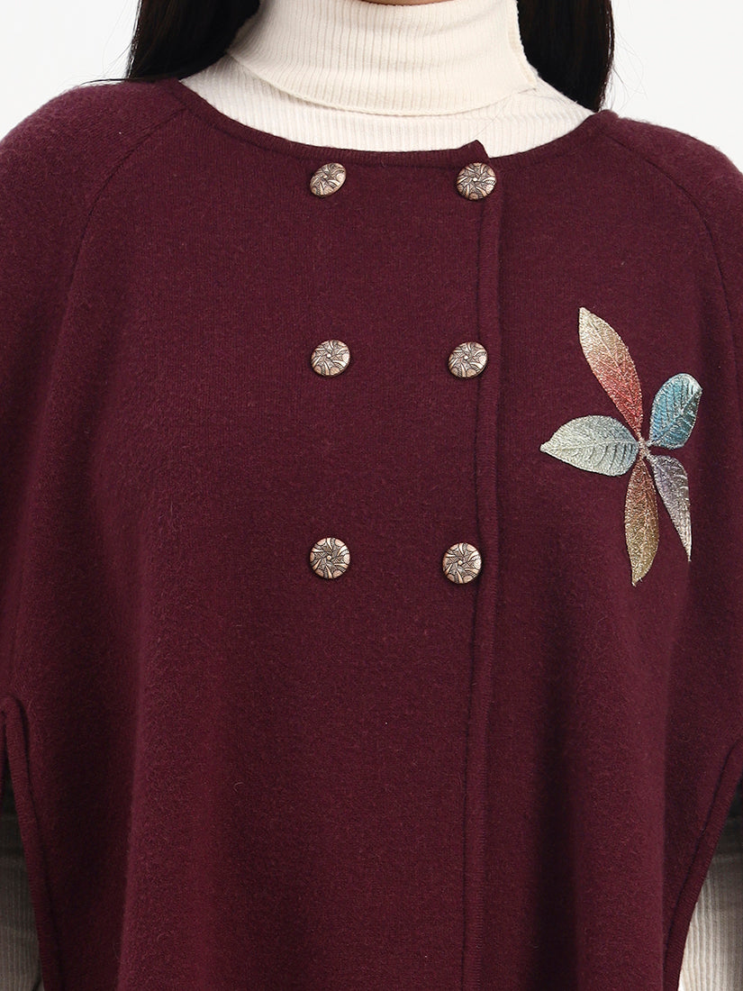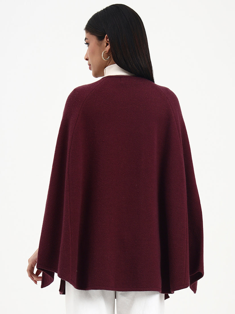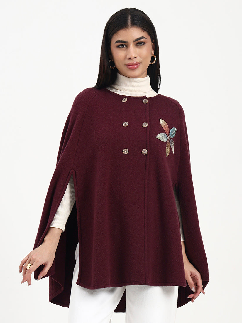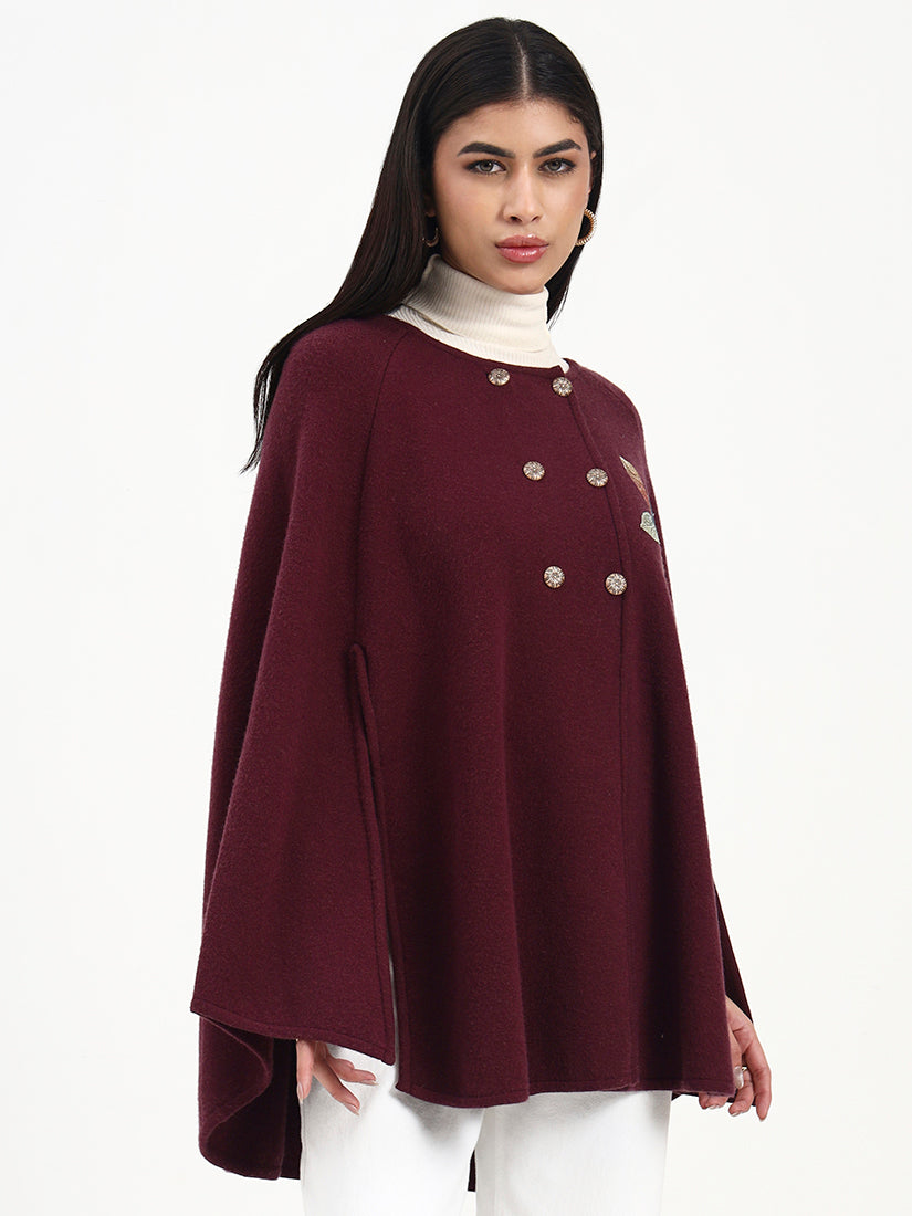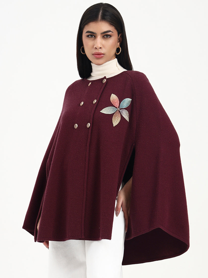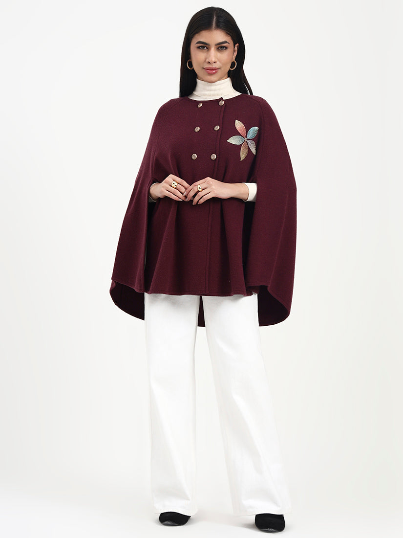 Rendered in a deep wine hue, this poncho is elevated by subtle floral embroidery and a graceful, flowing fall. The rich colour brings warmth and depth, while the relaxed shape allows for refined, easy movement from day to evening.