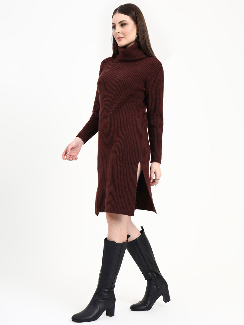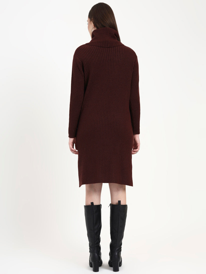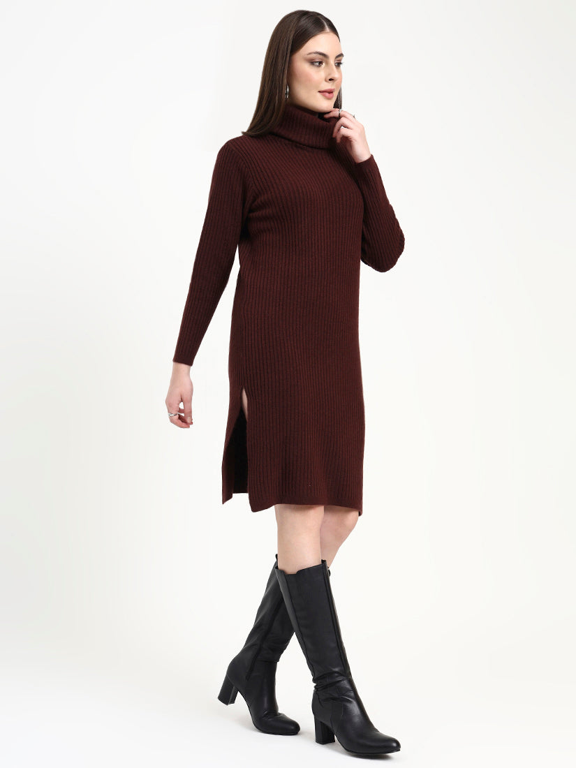 The Turtleneck Knit Dress brings warmth and elegance together in a deep, rich tone. Crafted from the finest wool, its ribbed form and high neckline evoke quiet sophistication with lasting comfort.