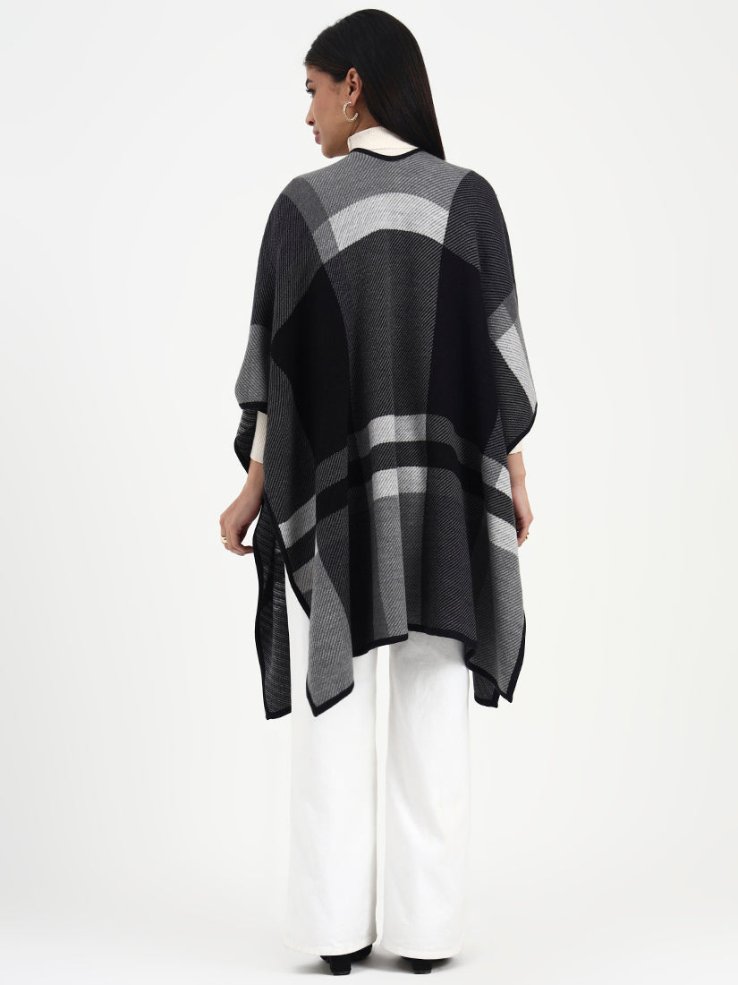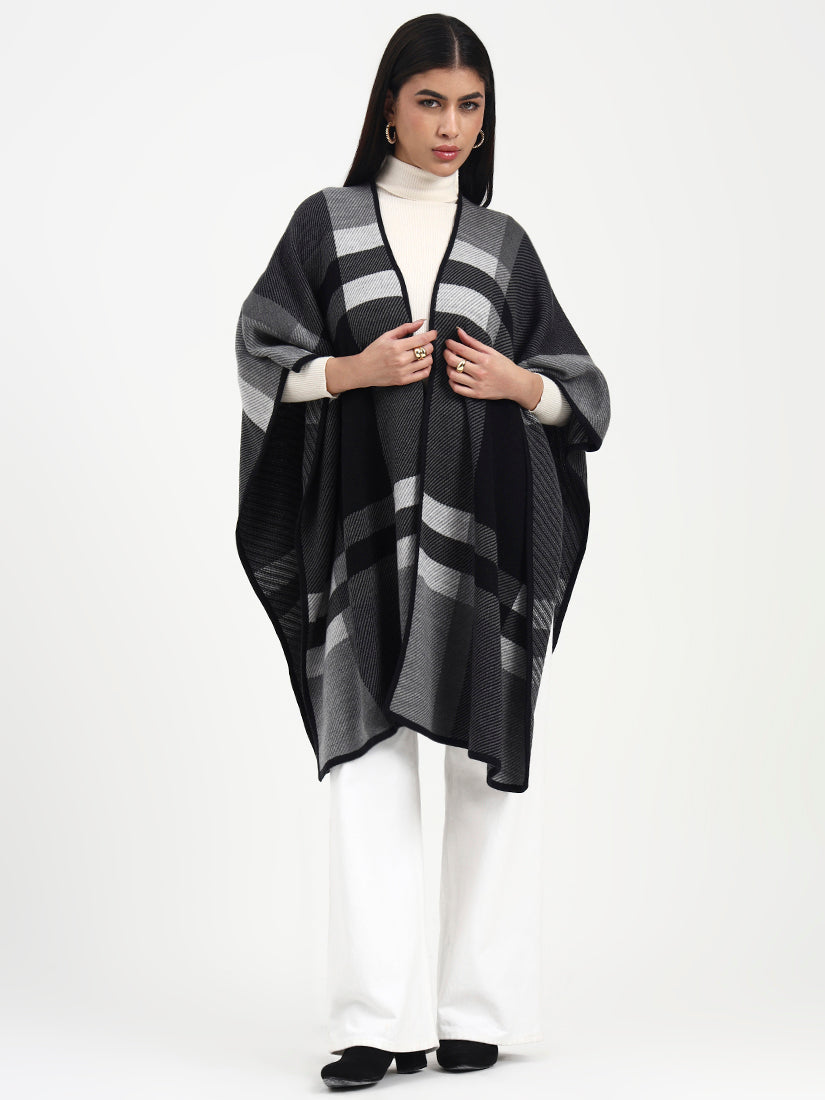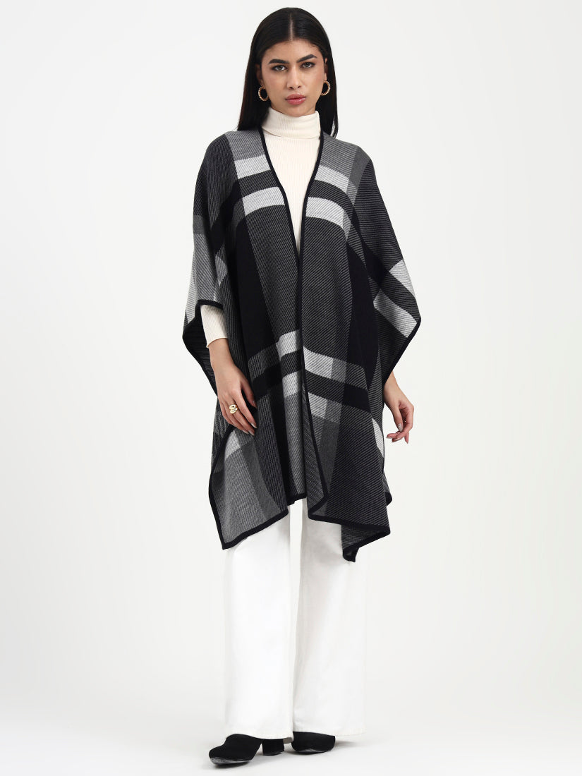 Defined by bold monochrome checks, this cape offers a contemporary take on classic winter layering. The clean lines and fluid drape create a sharp yet relaxed silhouette, perfect for city wear and refined travel looks.