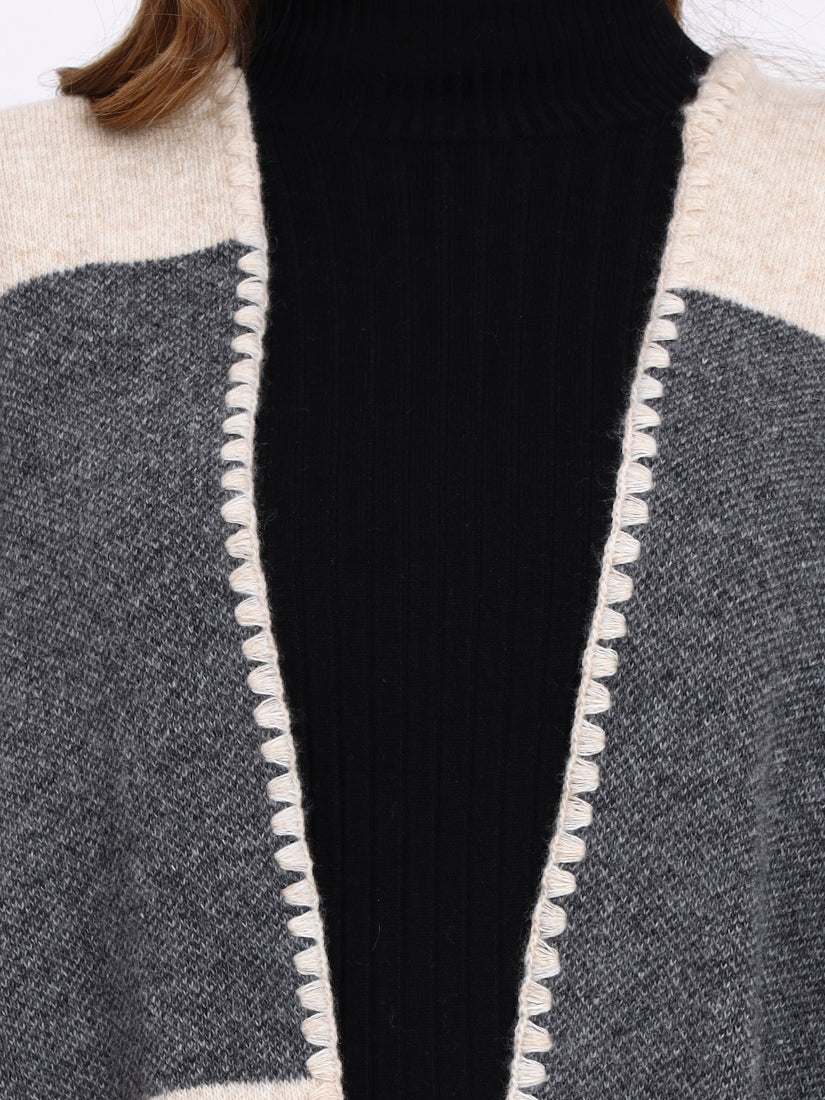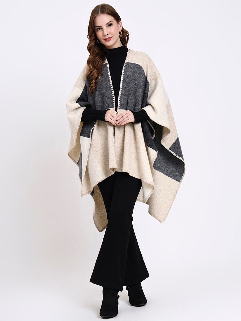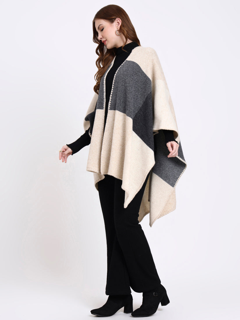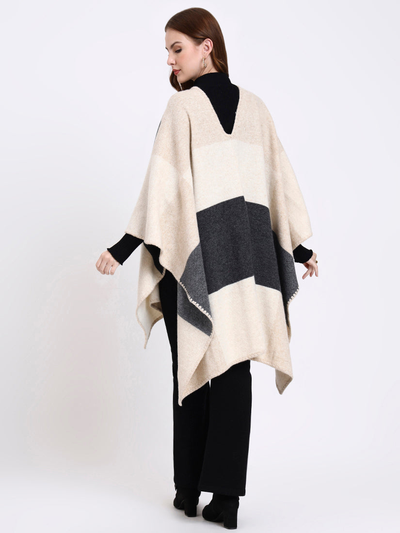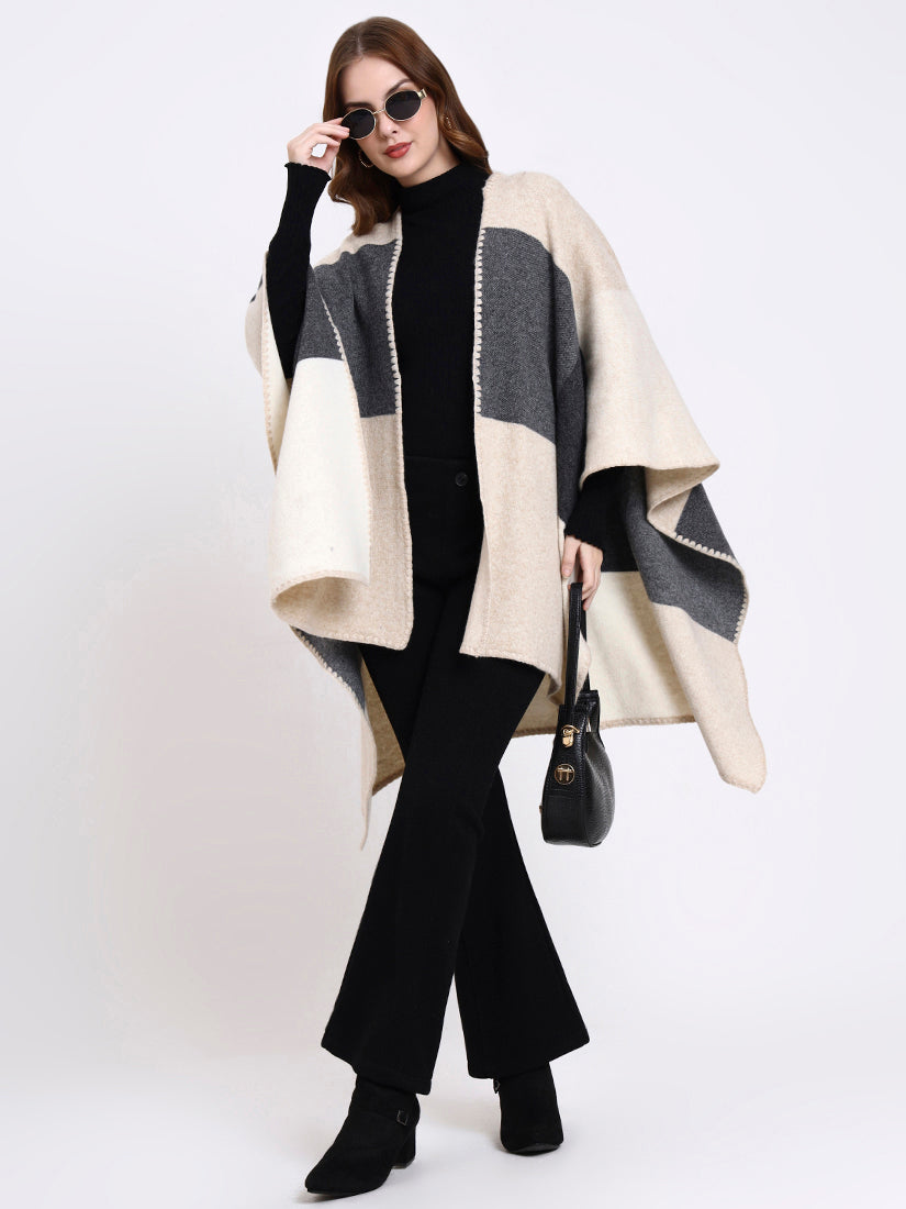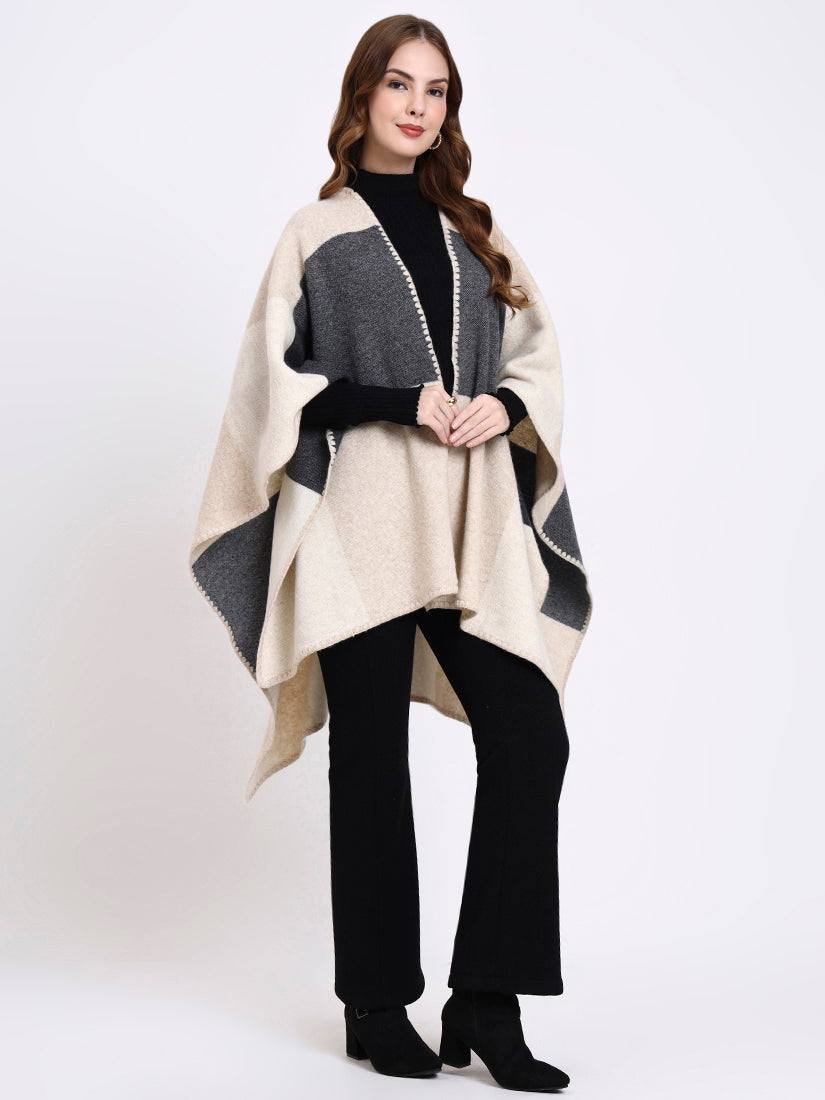 The soft interplay of cream and grey evokes a muted elegance, reminiscent of fog settling over winter meadows. The drape is airy yet warm, creating a refined balance perfect for layering in serene, understated luxury.